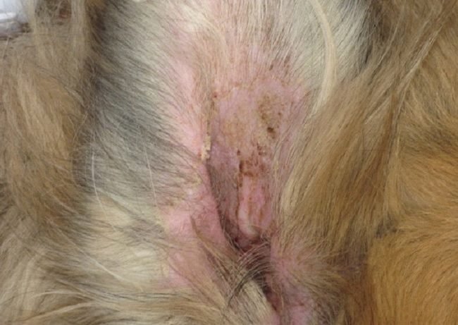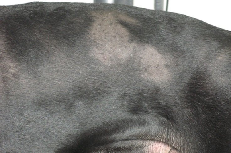 –    căderea exagerată a părului până la a prezenta alopecie (locuri fară păr) pe corp, în special pe coadă sau deasupra nasului sau în locurile unele se aplică zgarda sau hamul Fig.1