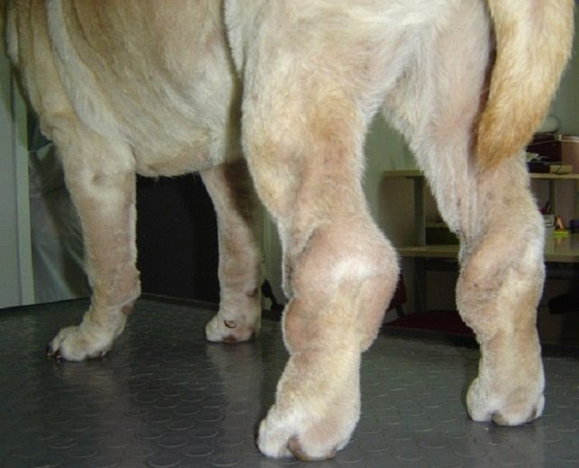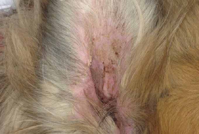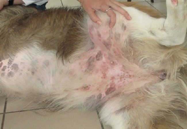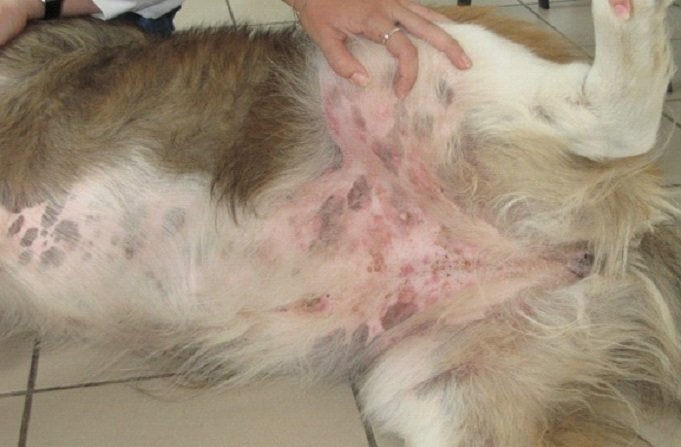 Semnele dermatologice (cutanate) sunt cele mai ușor de recunoscut și apar pentru că hormonii tiroidieni sunt foarte importanți pentru piele;  în primul rând aceștia  stimulează/inițiază creșterea parului și, în același timp, lipsa sau scăderea acestora sub nevoile organismului afectează bariera cutanată, iar pielea devine expusă la infecții  (același lucru se întâmplă și la nivel auricular, iar câinele va prezenta episoade de otită) Fig.3, Fig.4